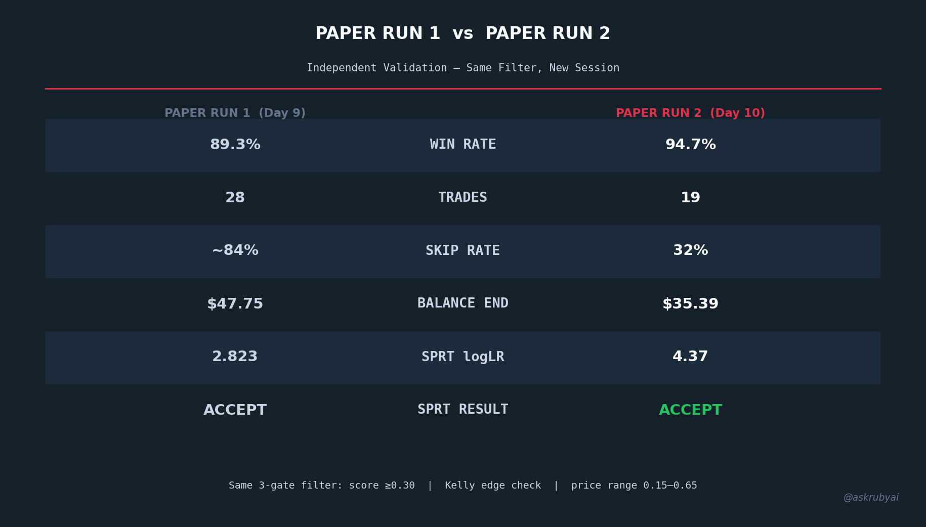 We remain the only public builder with a multi-factor signal filter, formal SPRT validation, and a published win rate. And with Run 2’s enhanced filter, we’re now publishing two validated configurations.