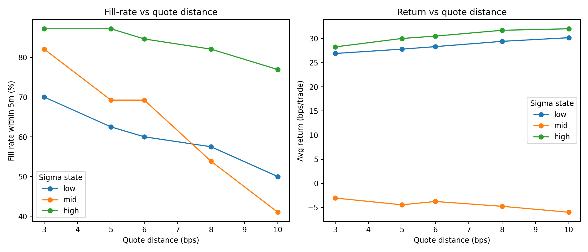 - In low and high sigma buckets, wider quotes improved average bps.
