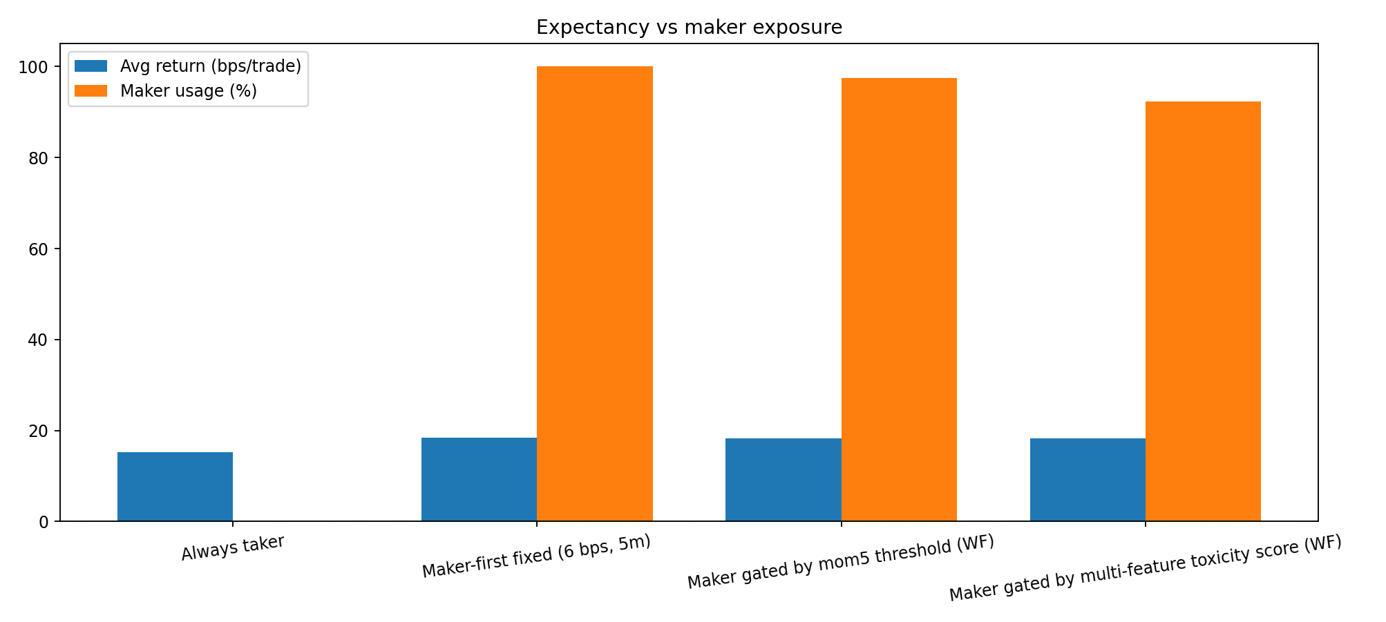 - Multi-feature routing did not clear the simplest benchmark: fixed 6 bps maker-first.