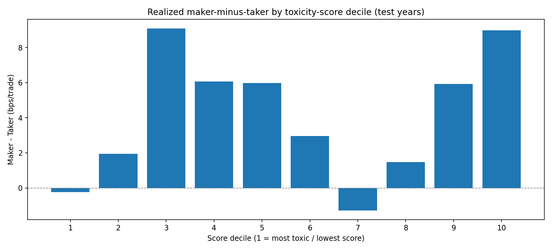 On years where score training was active (2025–2026), realized maker-minus-taker generally improves in higher score deciles, but it’s noisy and non-monotone.